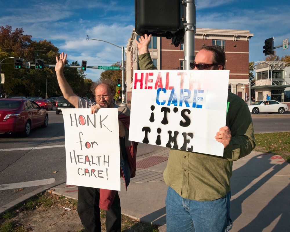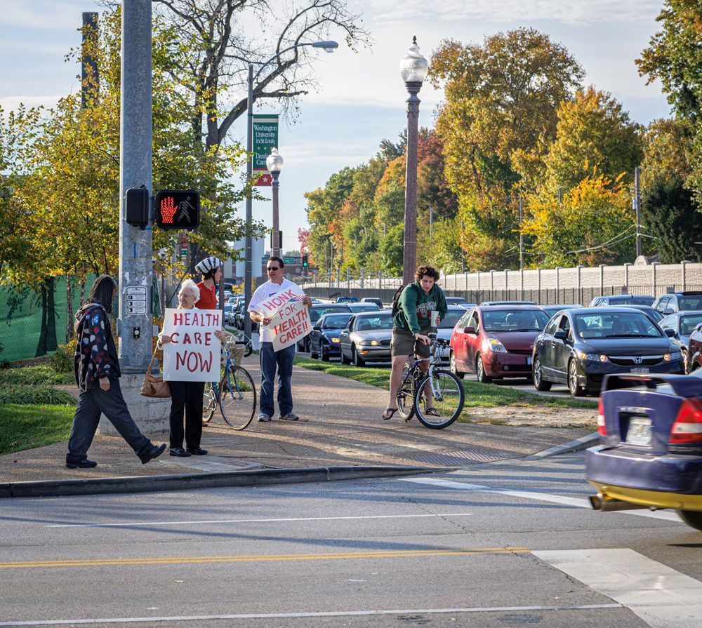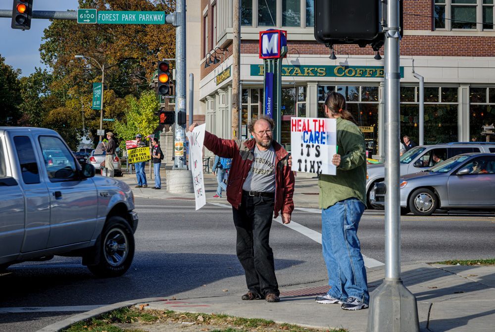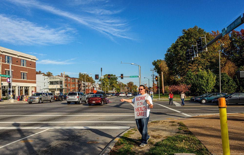This protest, although small, was one of the earliest (Oct. 2009) in the St. Louis area supporting the passage of the Affordable Care Act . Situated at the busy intersection of Skinker Blvd. and the Forest Park Parkway (adjacent to Washington University in St. Louis' campus. Other demonstrations sprang from this one to the eventual passage of the legislation, later called Obamacare.