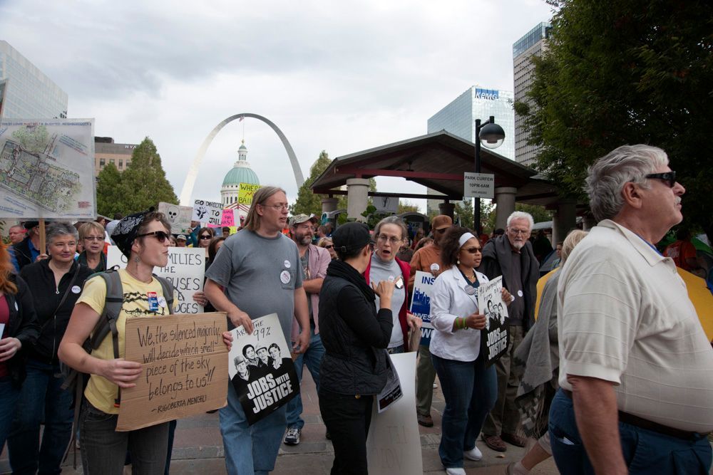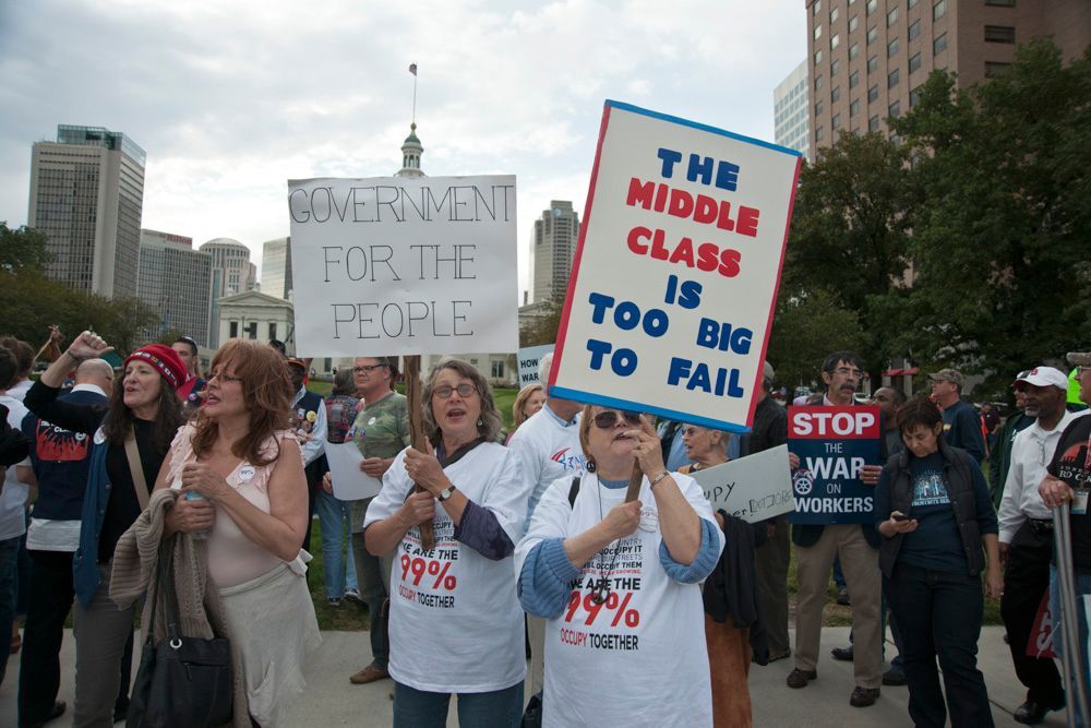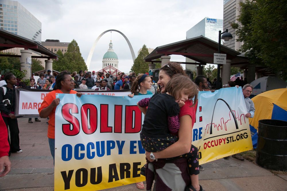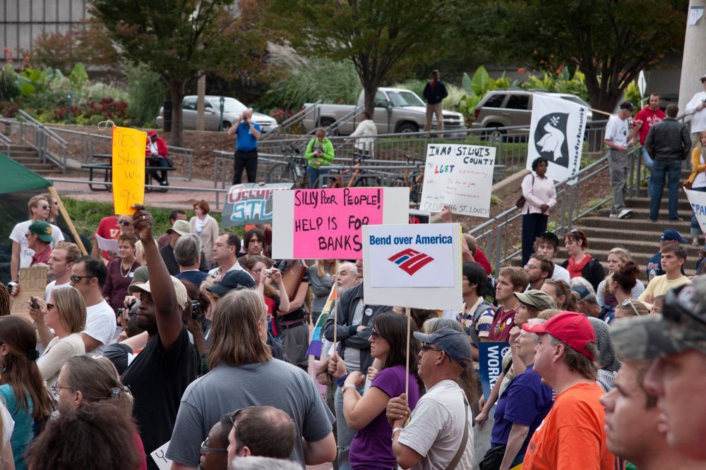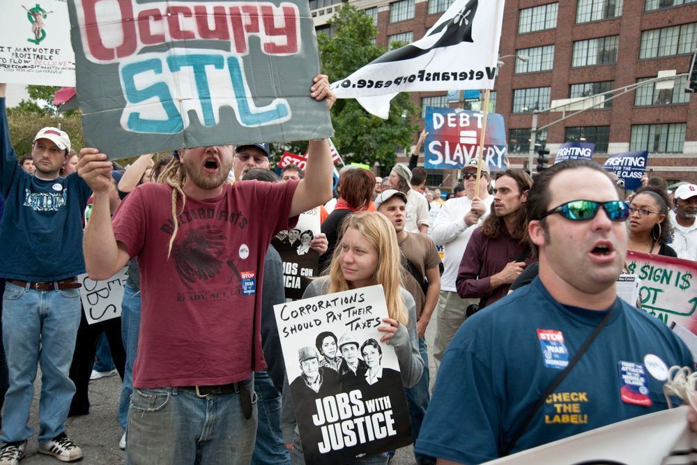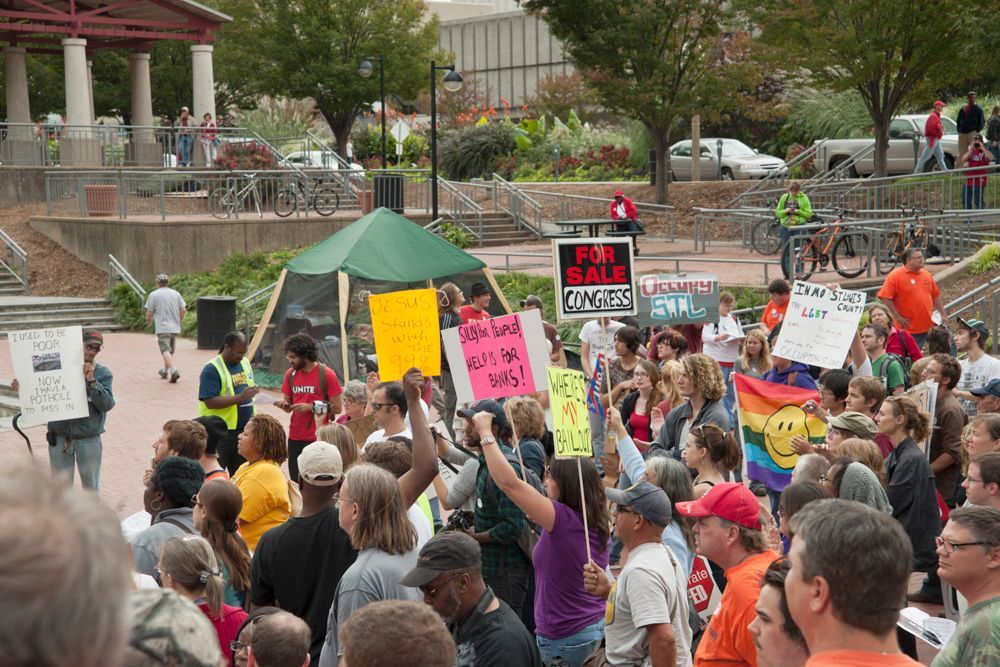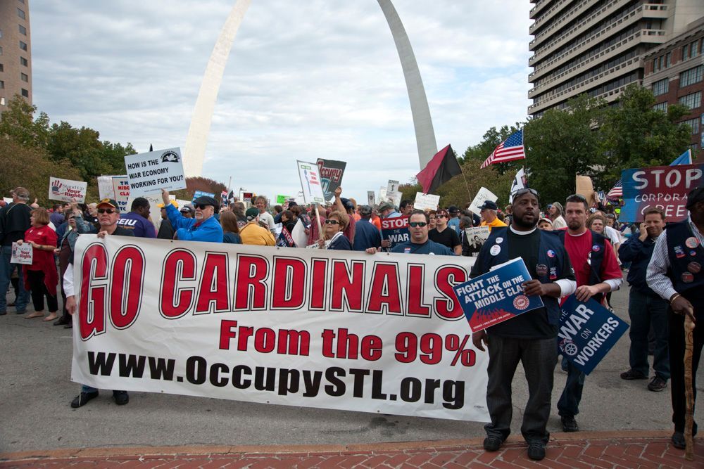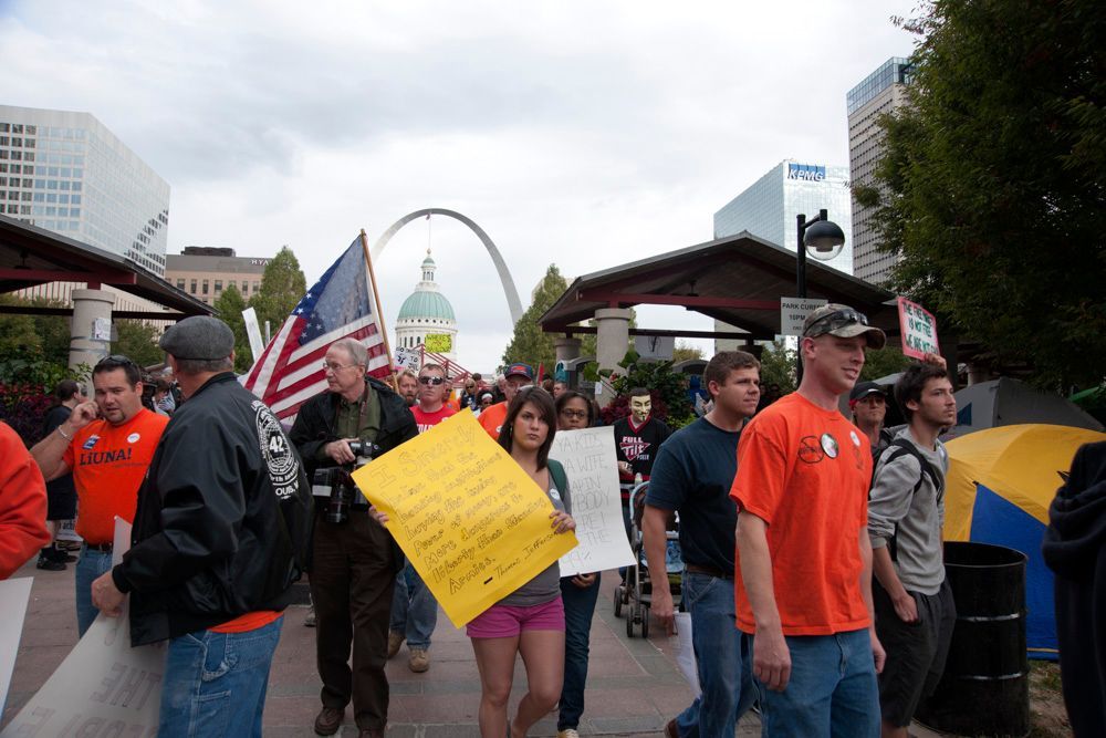 After the 2008 financial crisis, scrutiny toward the 1% wealthiest individuals and corporations became the focus of middle class Americans. Then the protests appeared to demonstrate their dissatisfaction with the income and taxation inequity of capitalism. This protest in downtown St. Louis, Missouri was one of the first to erupt in mid-America.