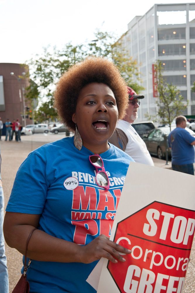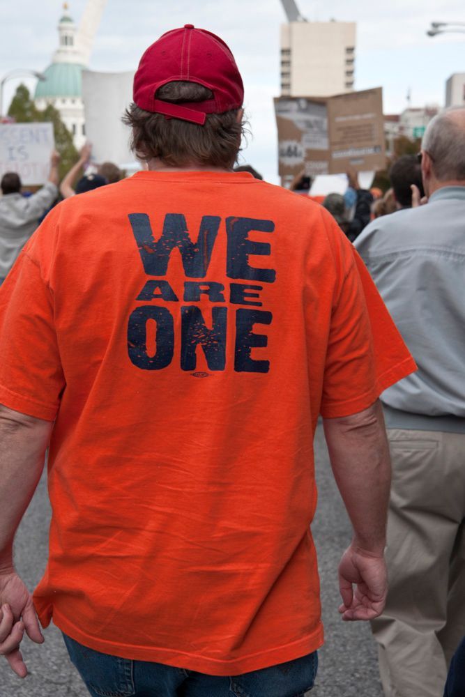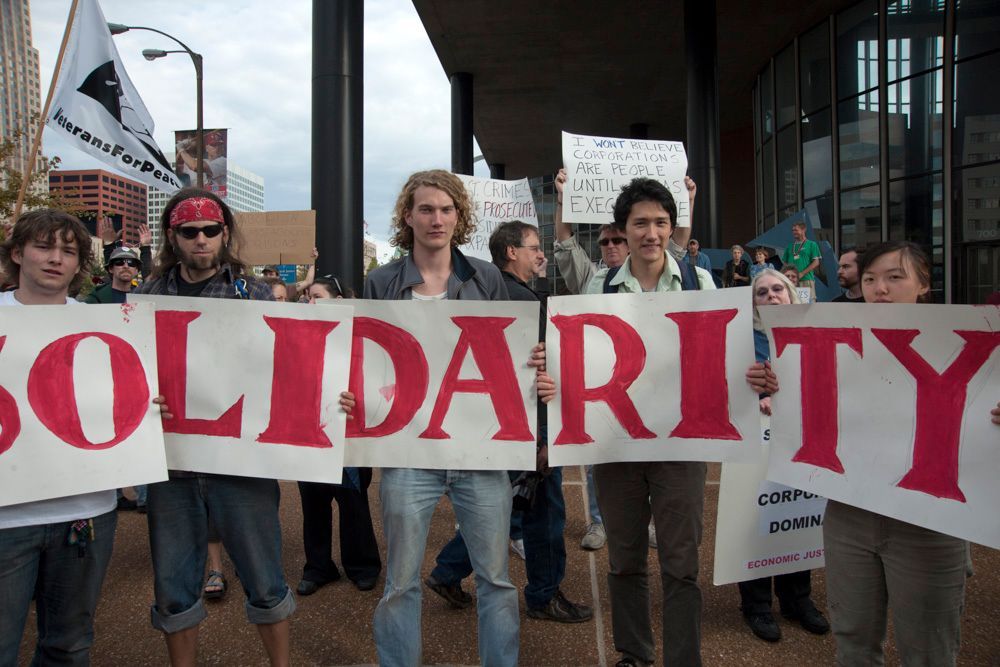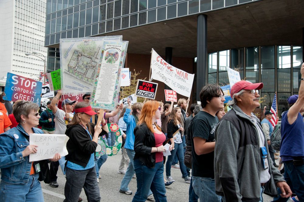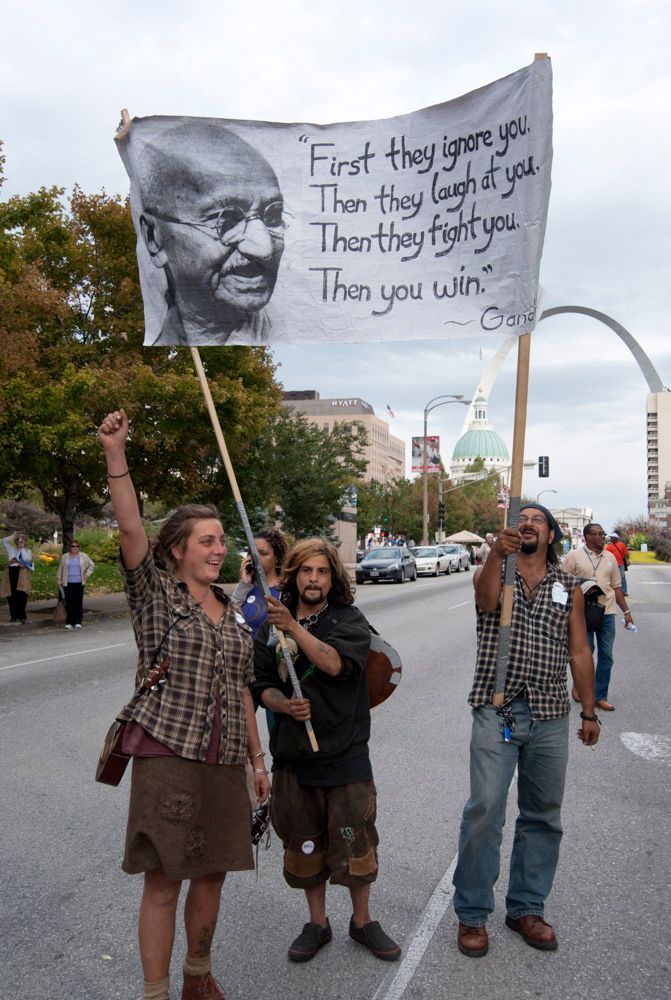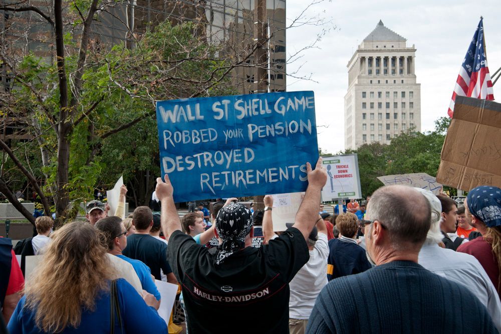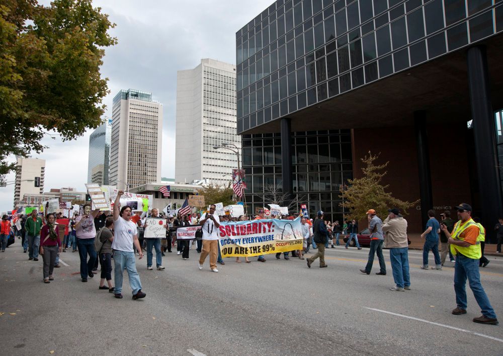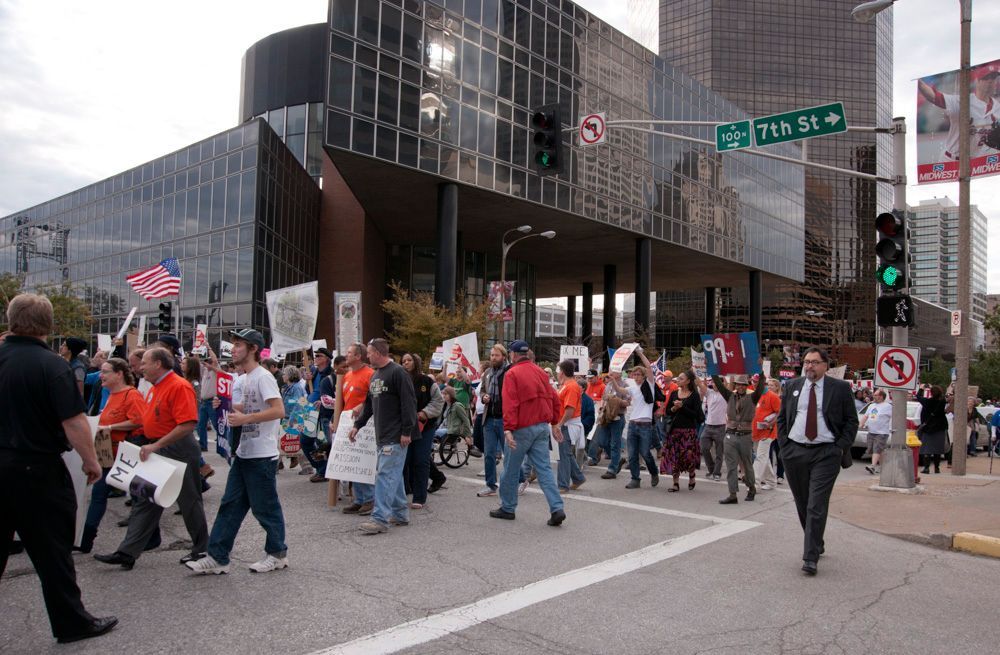 After the 2008 financial crisis, scrutiny toward the 1% wealthiest individuals and corporations became the focus of middle class Americans. Then the protests appeared to demonstrate their dissatisfaction with the income and taxation inequity of capitalism. This protest in downtown St. Louis, Missouri was one of the first to erupt in mid-America.