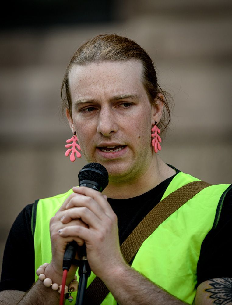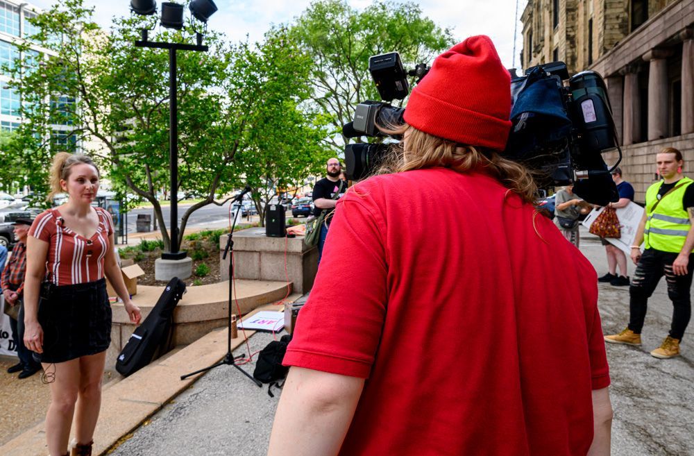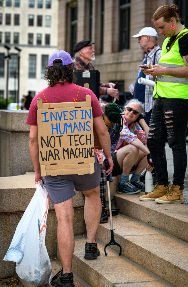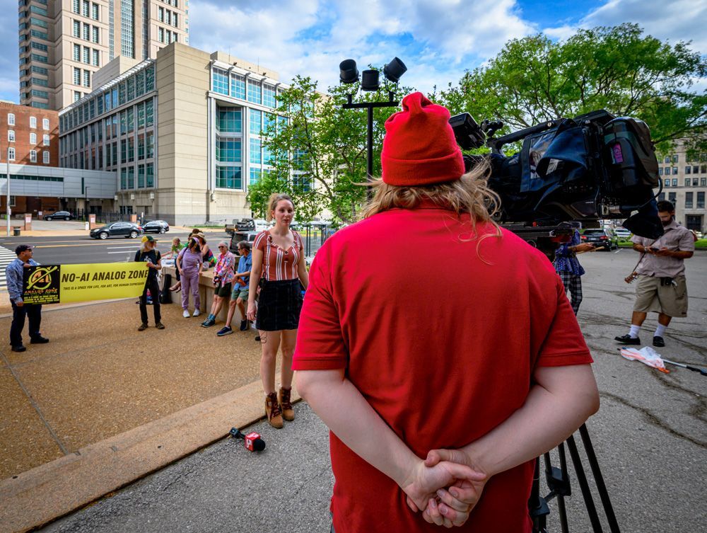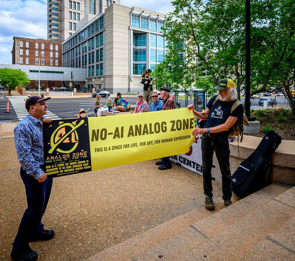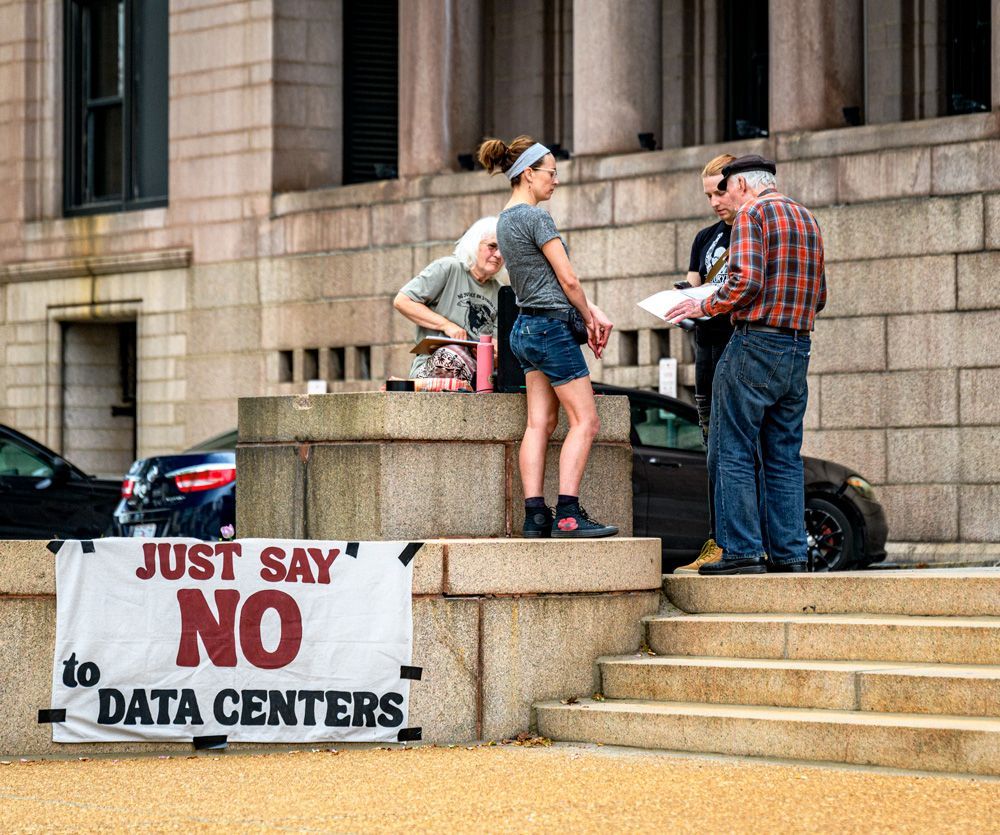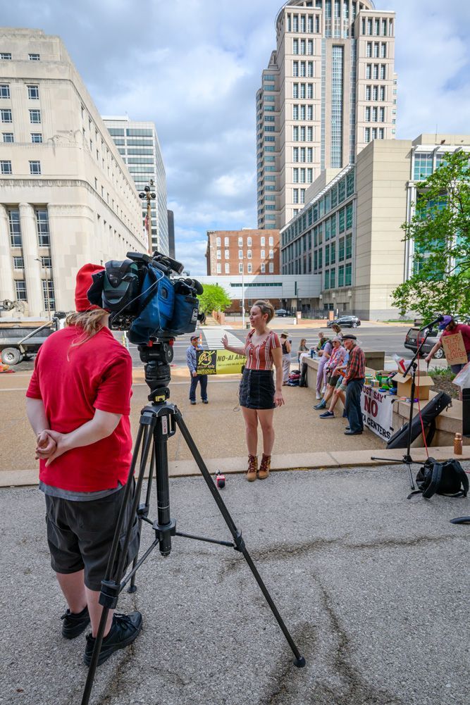 A small group of activists and supporters gathered in front of City Hall to protest efforts being made by developers and corporations to build data centers in the City of St. Louis that would bring few benefits, but huge disadvantages to citizens with regard to electrical usage, water resources, a discounted tax base, and other aspects.