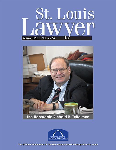 The late Honorable Richard B. Teitelman, shown here in his office in the St. Louis Municipal Courts building where he worked when not serving on the Missouri Supreme Court in Jefferson City. Judge Teitelman was gregarious, inquisitive, fair, and always concerned about those around him. He loved dining out and wrote regular restaurant reviews in this magazine for other attorneys. We lost Judge Teitelman in November 2016.