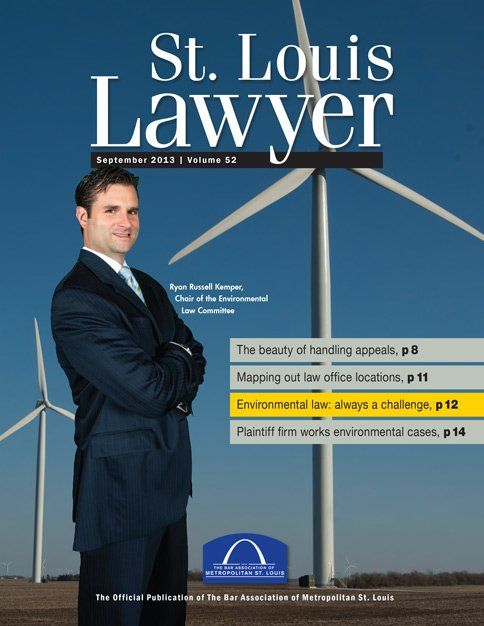 Attorney Ryan Kemper, who practices environmental law, was photographed for this cover in the studio against a green screen for time convenience, then married to an image from a wind farm near Bloomington, Illinois to create a topic-sensitive cover that told the story.