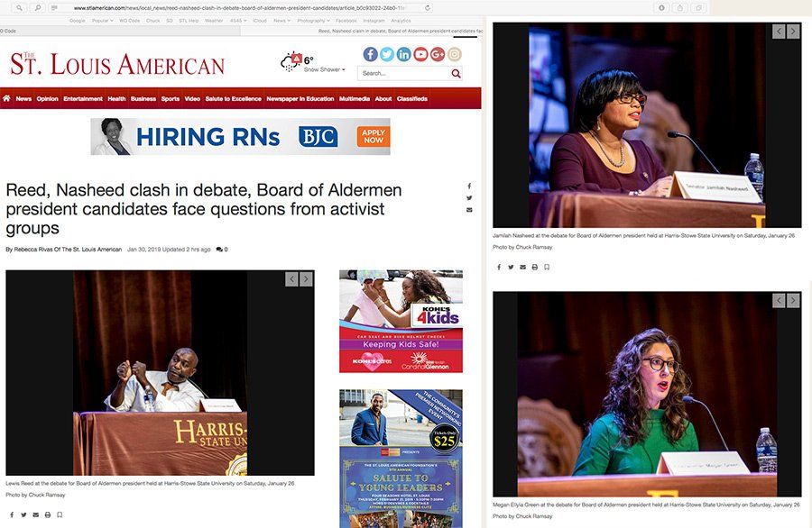 When their photographers was unable to be in two places at once, the St. Louis American newspaper request using my photos of the candidates for the St. Louis City Board of Aldermen president, who were debating at Harris Stowe State University. Shown in the photos are incumbent Lewis Reed, State Senator Jamilah Nasheed, and Alderman Megan Green. Rebecca Rivas, staff reporter, wrote the article.